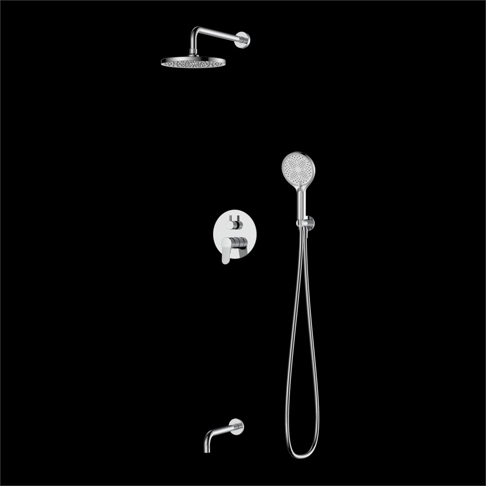комплектациясмеситель: внешняя часть накладка, ручка, излив, встраиваемая часть блок, держатель ручного душа, ручная лейка 3 режима, держатель верхнего душа, тропический верхний душ, душевой шланг 1,5м PVC, паспорт изделия