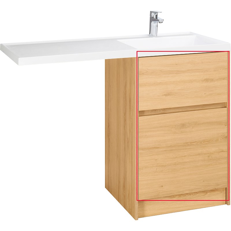 Фасад для тумбы Лондри под стиральную машину выполнен из влагостойкой ламинированной плиты в древесной отделке цвета Дуб Сантана. Корпус тумбы и фасад приобретаются отдельно. Верхний ящик открывается с помощью системы push-to-open, а нижний - за фасад с помощью удобного выпила под углом. Ящики выдерживают нагрузку до 25 кг. Тумба установлена на регулируемые опоры, которые находятся за цоколем. Тумба комплектуется раковиной Лондри 120 из прочного литого мрамора, который устойчив к воздействию химических средств. Широкое крыло раковины обеспечивает ванную комнату дополнительным функциональным пространством. Дополнительно к тумбе можно приобрести шкаф-колонну Лондри и зеркальный шкаф Лондри 120.