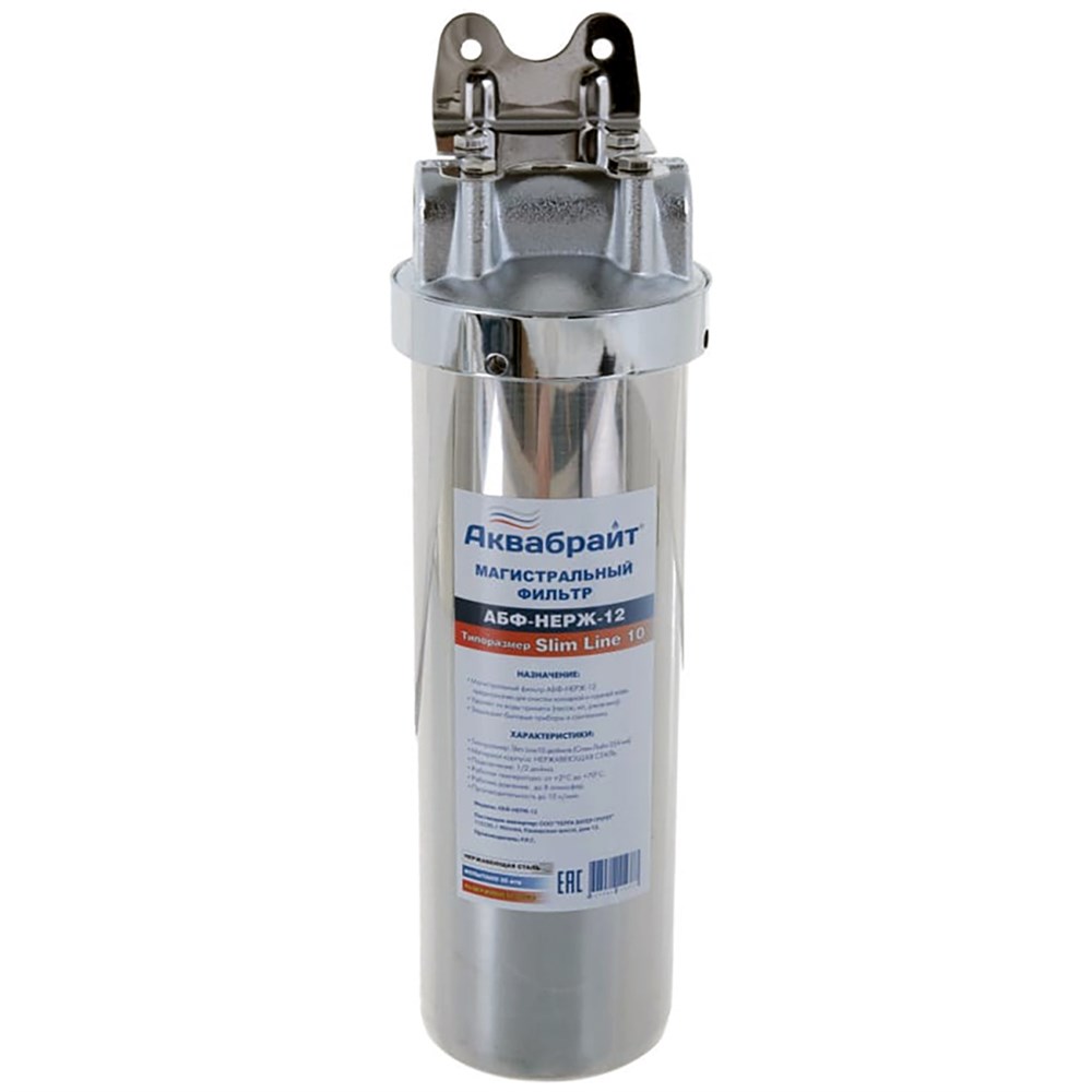 Фильтр для воды АКВАБРАЙТ магистральный, 1/2", корпус из нержавеющей стали, Slim Line 10", в комплекте кронштейн и ключ (АБФ-НЕРЖ-12)