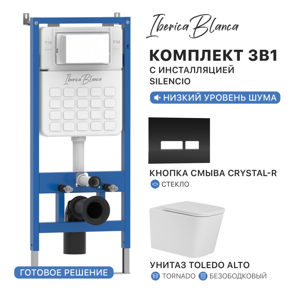 Комплект 3в1 IBERICA BLANCA инсталляция SILENCIO, унитаз TOLEDO ALTO белый, кнопка смыва CRYSTAL-R черный глянцевый (IB001.TLA.234.2211)