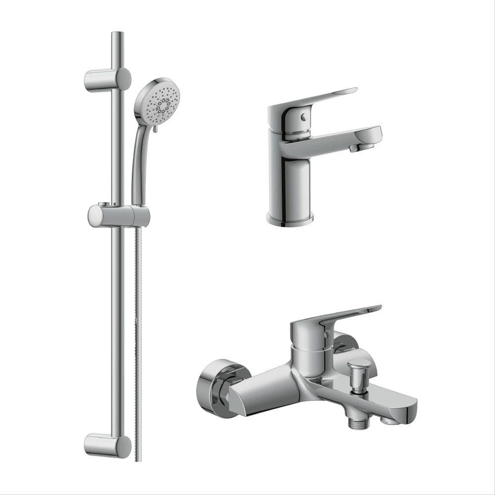 комплектациясмеситель для раковины, смеситель для ванны, шланги подводки 1/2", 45 см, душевой набор (душевая лейка, стойка, душевой шланг), S-образные эксцентрики 65 гр., крепеж