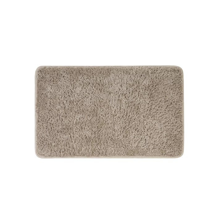 Мягкий коврик для ванной светло-коричневого цвета с плотным высоким ворсом (2 см), очень приятный на ощупь. Стриженый ворс из микрофибры отлично держит форму, легко чистится и быстро сохнет. Коврик подойдет для ванной и туалета.