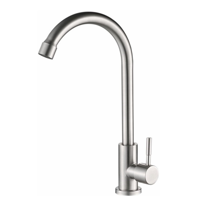 Кран на одну воду бренда Haiba. Изготовлен из нержавеющей стали. Картридж 35 мм. Укомплектован аэратором. Гибкая подводка 40 см. С поворотным изливом.