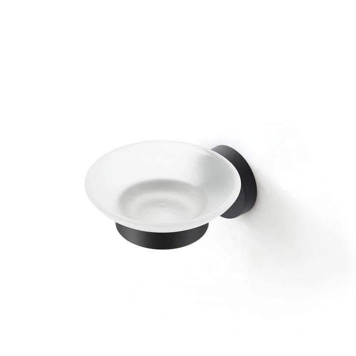 Мыльница Sena из матового белого стекла в держателе чёрного матового цвета – доступное функциональное решение для современной ванной комнаты.