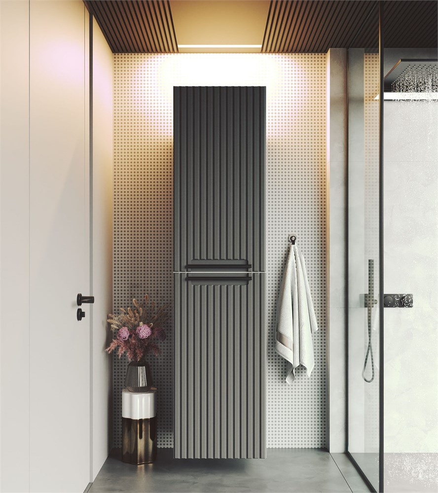 Глубокая вертикальная фрезеровка фасадов придает уникальность тумбе и создает объем, что является очень интересным дизайнерским решением.