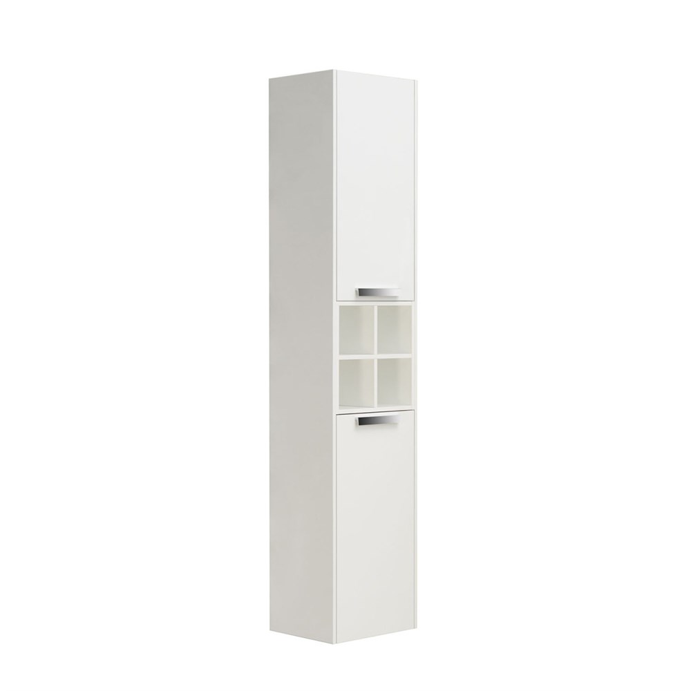Шкаф-колонна Lago в современном стиле от испанского бренда Roca, выполненная из высококачественной влагостойкой ЛДСП и МДФ в цвете белый глянец, с бельевой корзиной. Покупатель самостоятельно определяет сторону открытия фасада верхнего ящика налево или направо, путем навешивания петель на корпусе изделия.