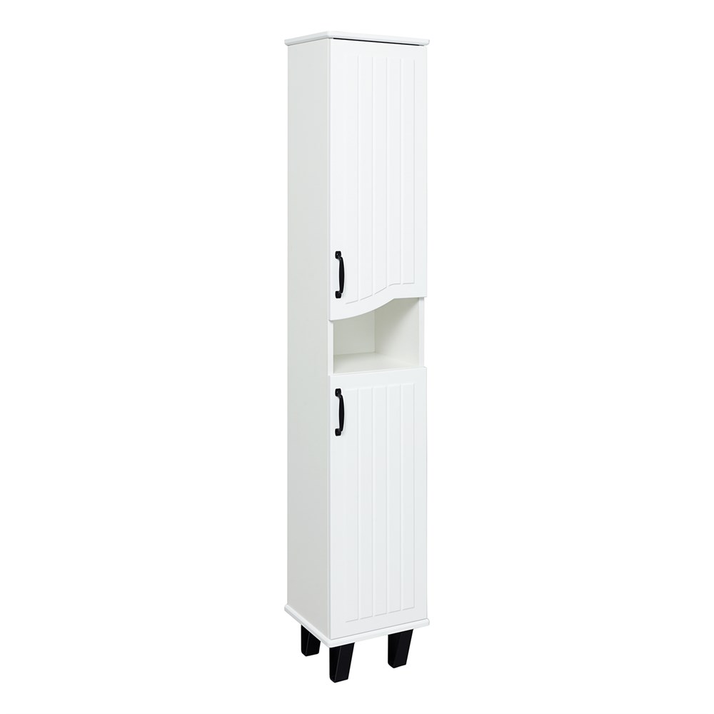 Шкаф-колонна напольный с двумя распашными дверками и открытой нишей посередине. В верхнем и нижнем отделениях по одной встроенной полке. Петли со встроенным доводчиком, ножки черные пластиковые -4шт, ручки черные -2шт. Выпускается только в правом исполнении.