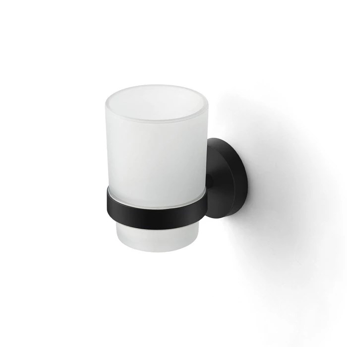 Стакан Sena из матового белого стекла в держателе-подстаканнике чёрного матового цвета – доступное функциональное решение для современной ванной комнаты.