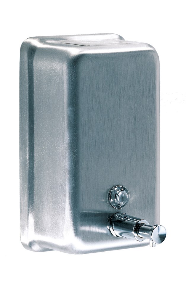 • Диспенсер для жидкого мыла объемом 1,2 л, изготовлен из нержавеющей стали AISI 304 толщиной 1 мм, устанавливается непосредственно на стену и управляется вручную с помощью кнопки.