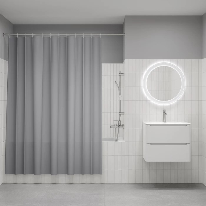 Текстильная светло-серая штора для ванной будет гармонично смотреться и в светлом, и в темном интерьере.