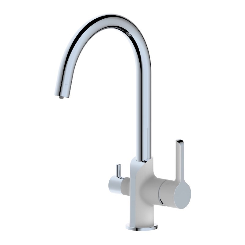 Смеситель для кухни бренда Haiba. Изготовлен из латуни. Укомплектован аэратором. Гибкая подводка 40 см. С поворотным изливом.