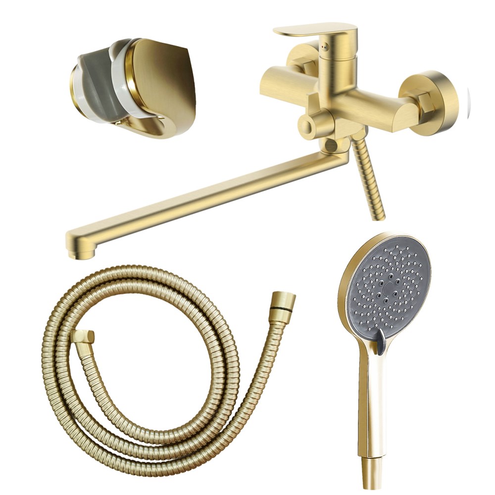 Смеситель для ванны Azario Alanti керамический картридж, длинный излив, с ручным душем, шланг 150 см, золото матовое (AZ-K1732MG)