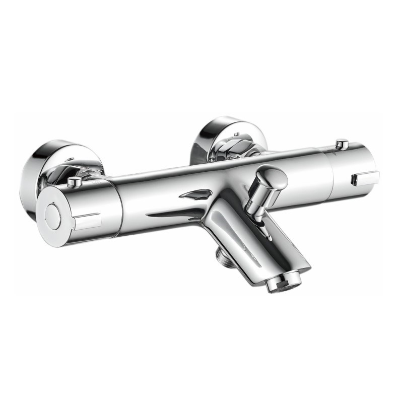 Смеситель для ванны с термостатом. Керамический картридж 35 мм. Диаметр декоративных чашек 60 мм. Душевой гарнитур в комплекте. Межосевое расстояние (расстояние между выходом горячей и холодной трубы) 150 мм. Данное расстояние изменяется за счет входящих в комплект эксцентриков на 10 мм в большую или меньшую стороны.