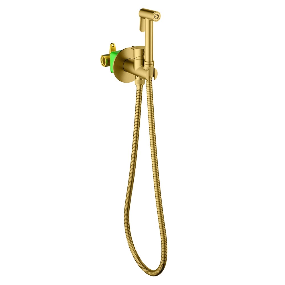 комплектацияСмеситель скрытого монтажа с подключением шланга гигиенического душа - 1 шт.Декоративная накладка смесителя (латунная) - 1 шт.Ручка управления смесителем - 1 шт.Шланг душа (латунный) 1,2 м - 1 шт.Гигиеническая лейка (латунная) - 1 шт.Инструкция - 1 шт.