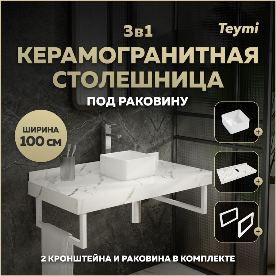 Столешница керамогранитная 100 см белый мрамор с раковиной Teymi Helmi Mini 24 кронштейны 2 шт. белые в комплекте F14048