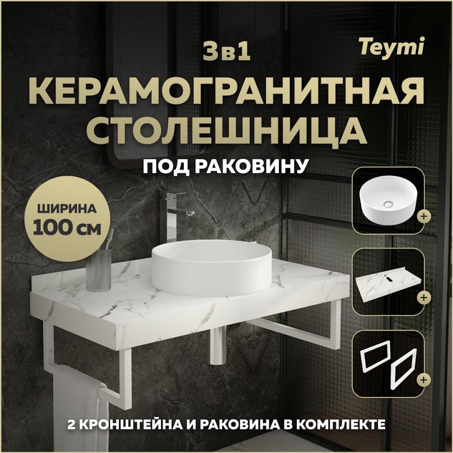 Столешница керамогранитная 100 см белый мрамор с раковиной Teymi Lina D41 кронштейны 2 шт. белые в комплекте F14063