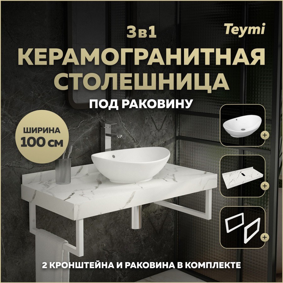 Столешница керамогранитная 100 см белый мрамор с раковиной Teymi Lori 60 кронштейны 2 шт. белые в комплекте F14058