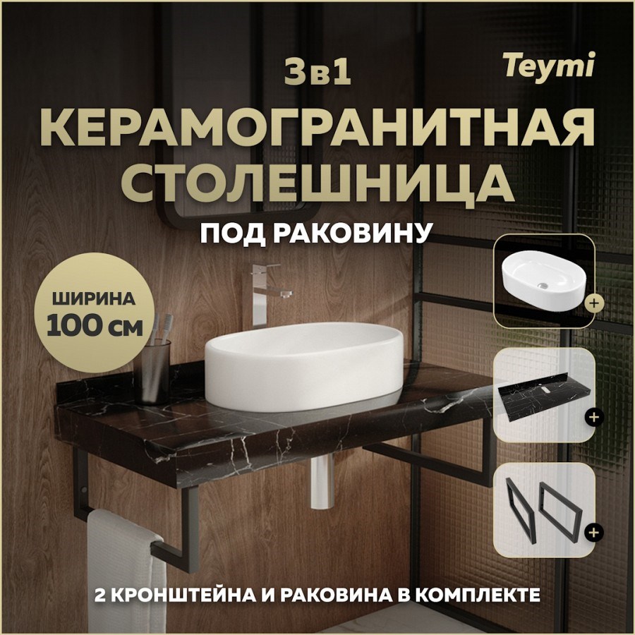 Столешница керамогранитная 100 см черный мрамор с раковиной Teymi Iva 52 кронштейны 2 шт. черные в комплекте F14429