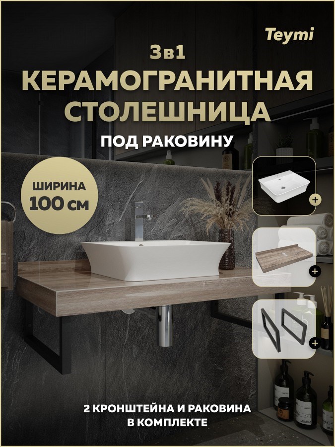 Столешница керамогранитная 100 см дуб кашмир с раковиной Teymi Aina 49 кронштейны 2 шт. черные в комплекте F15698