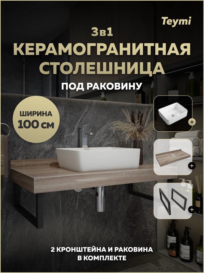 Столешница керамогранитная 100 см дуб кашмир с раковиной Teymi Helmi 50 кронштейны 2 шт. черные в комплекте F15694