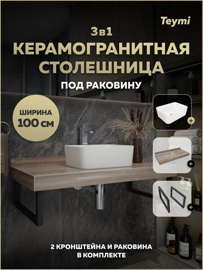 Столешница керамогранитная 100 см дуб кашмир с раковиной Teymi Helmi Mini 40 кронштейны 2 шт. черные в комплекте F15714