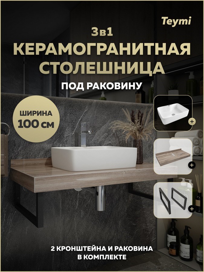 Столешница керамогранитная 100 см дуб кашмир с раковиной Teymi Helmi S 48 кронштейны 2 шт. черные в комплекте F15702