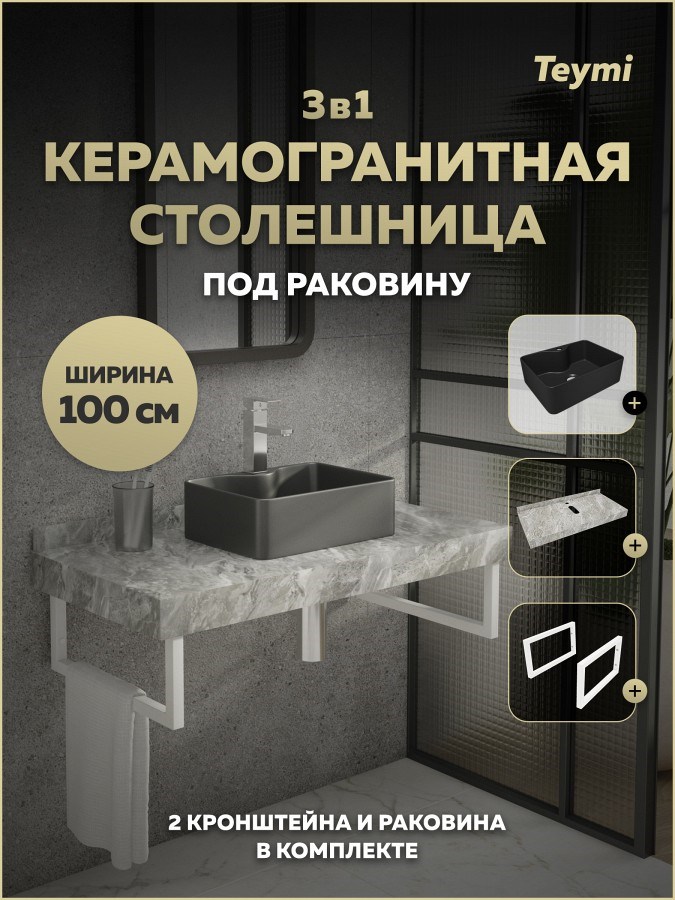 Столешница керамогранитная 100 см серый мрамор с раковиной Teymi Helmi Mini 41 черная матовая кронштейны 2 шт. белые в комплекте F15475