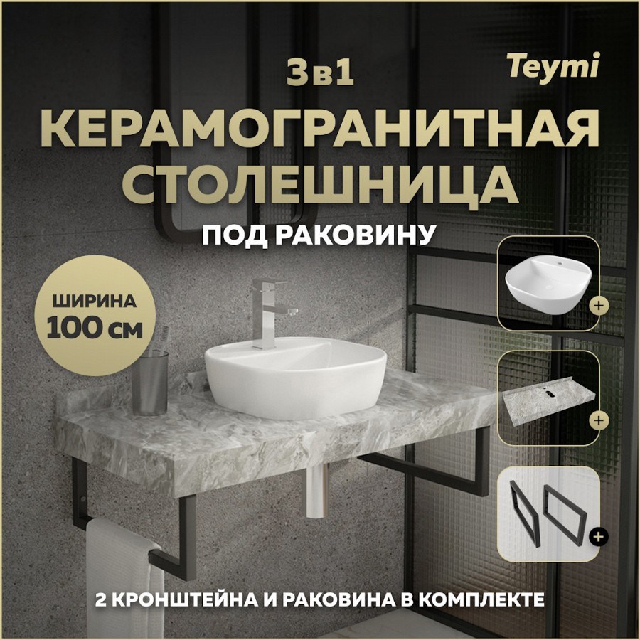 Столешница керамогранитная 100 см серый мрамор с раковиной Teymi Solli 40 кронштейны 2 шт. черные в комплекте F14318