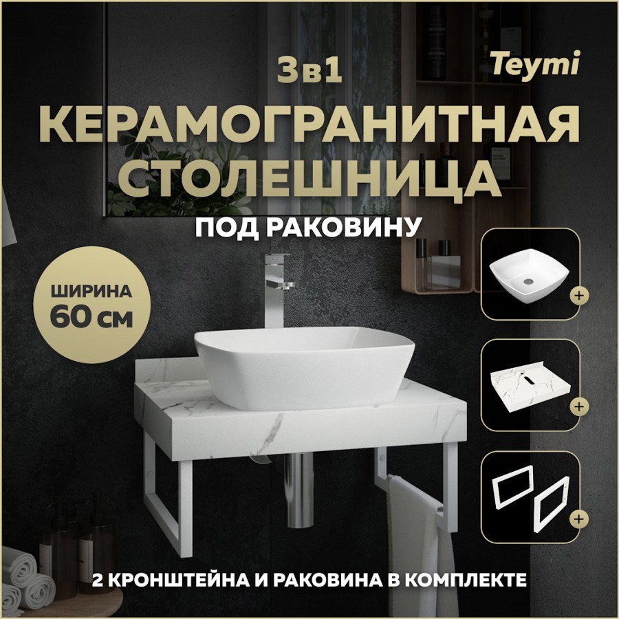 Столешница керамогранитная 60 см белый мрамор с раковиной Teymi Kati 43 кронштейны 2 шт. белые в комплекте F13957