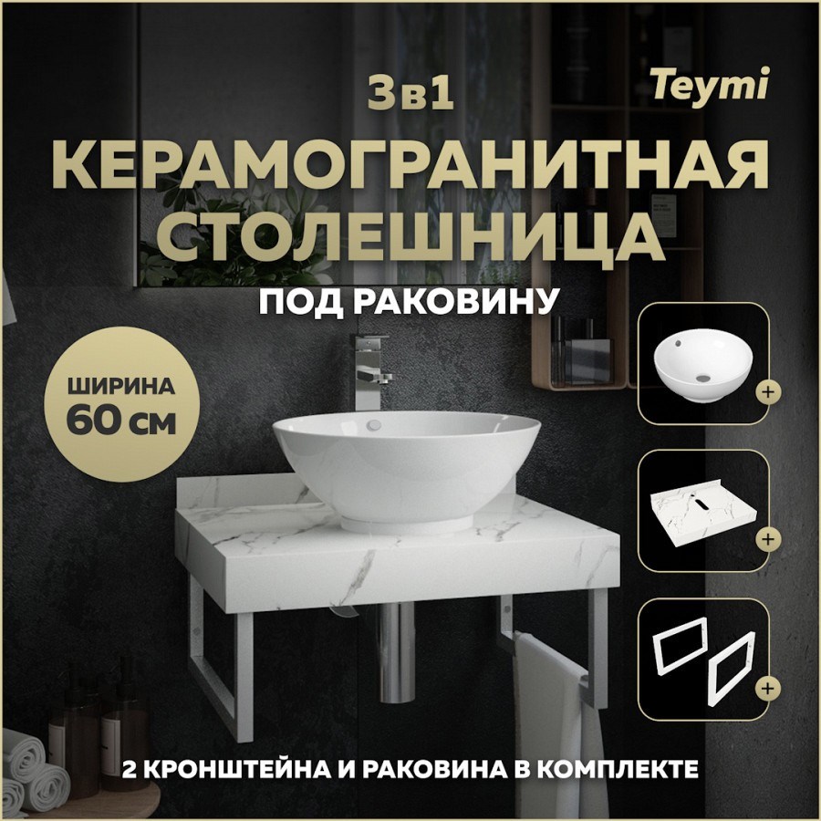 Столешница керамогранитная 60 см белый мрамор с раковиной Teymi Lina kuppi D40 кронштейны 2 шт. белые в комплекте F13955