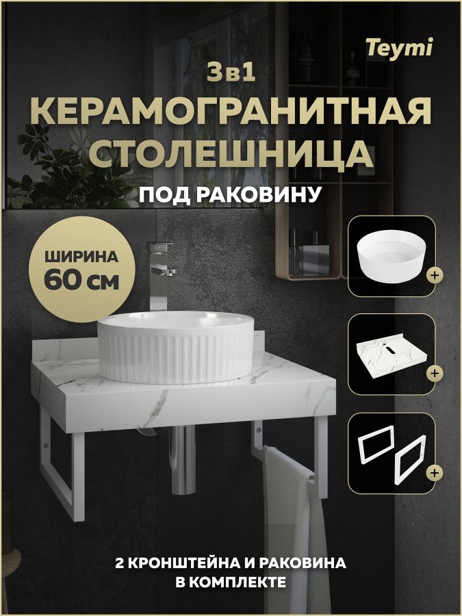 Столешница керамогранитная 60 см белый мрамор с раковиной Teymi Martta D36 кронштейны 2 шт. белые в комплекте F15446