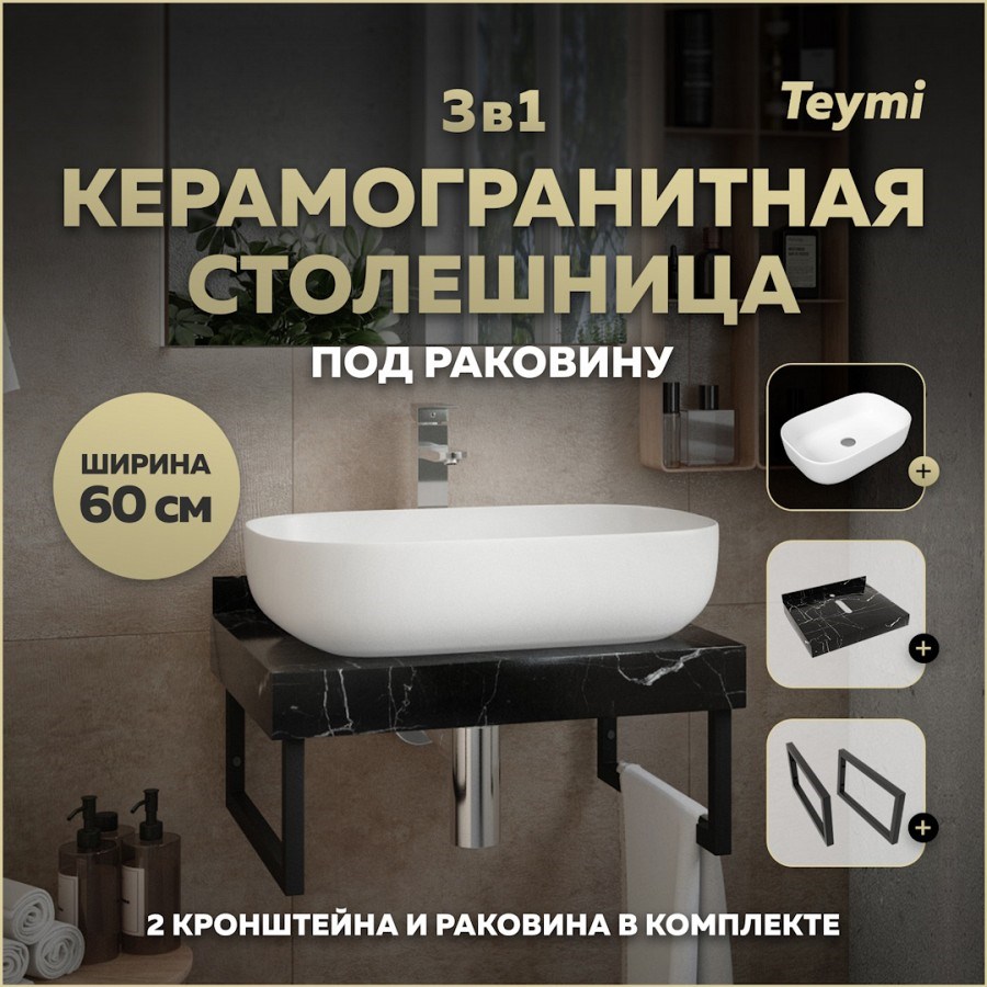 Столешница керамогранитная 60 см черный мрамор с раковиной Teymi Solli 60 кронштейны 2 шт. черные в комплекте F14325