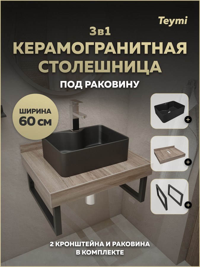 Столешница керамогранитная 60 см дуб кашмир с раковиной Teymi Helmi Mini 41 черная матовая кронштейны 2 шт. черные в комплекте F15577