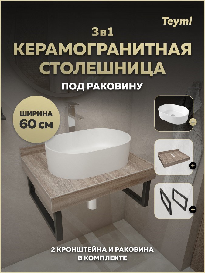 Столешница керамогранитная 60 см дуб кашмир с раковиной Teymi Iva 46 кронштейны 2 шт. черные в комплекте F15567