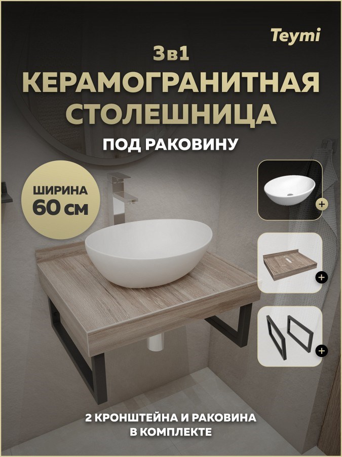 Столешница керамогранитная 60 см дуб кашмир с раковиной Teymi Lori 40 кронштейны 2 шт. черные в комплекте F15560