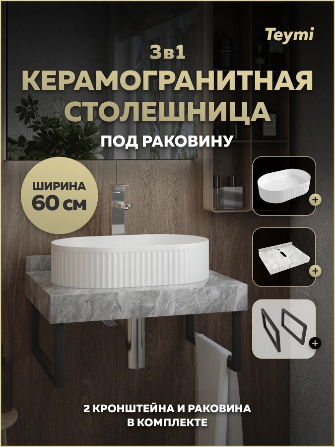 Столешница керамогранитная 60 см серый мрамор с раковиной Teymi Martta 50 кронштейны 2 шт. черные в комплекте F15436