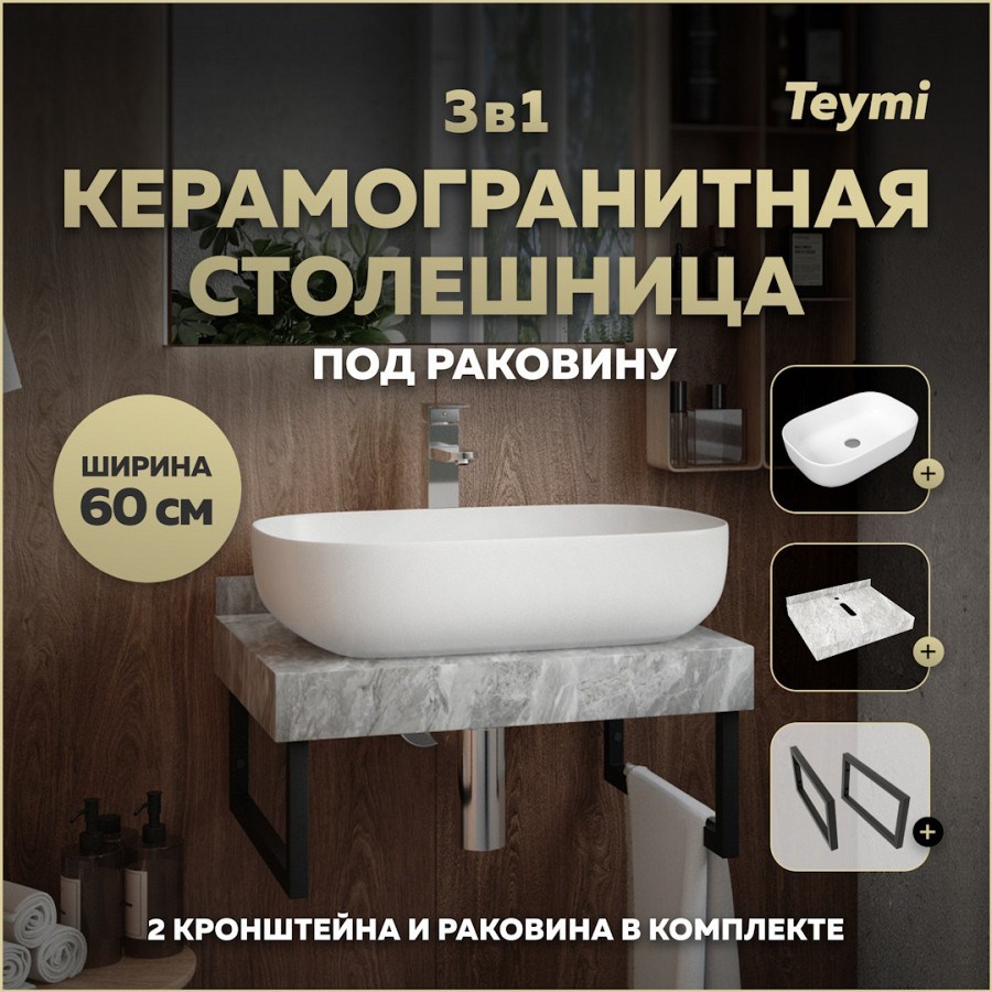 Столешница керамогранитная 60 см серый мрамор с раковиной Teymi Solli 60 кронштейны 2 шт. черные в комплекте F14200