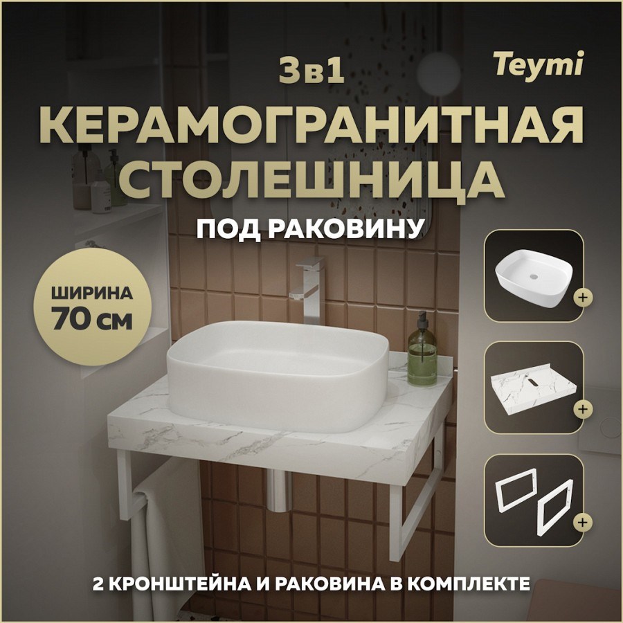Столешница керамогранитная 70 см белый мрамор с раковиной Teymi Solli 51 кронштейны 2 шт. белые в комплекте F13996