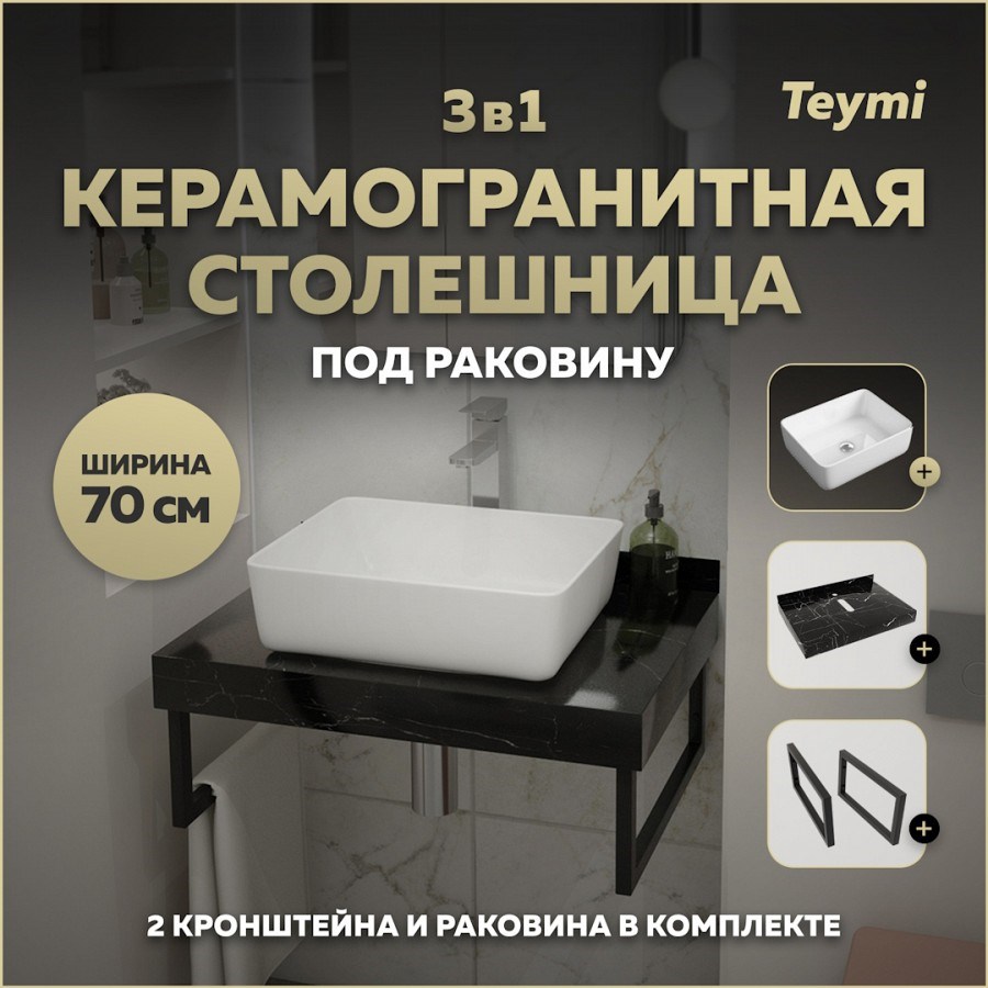 Столешница керамогранитная 70 см черный мрамор с раковиной Teymi Helmi 50 кронштейны 2 шт. черные в комплекте F14356