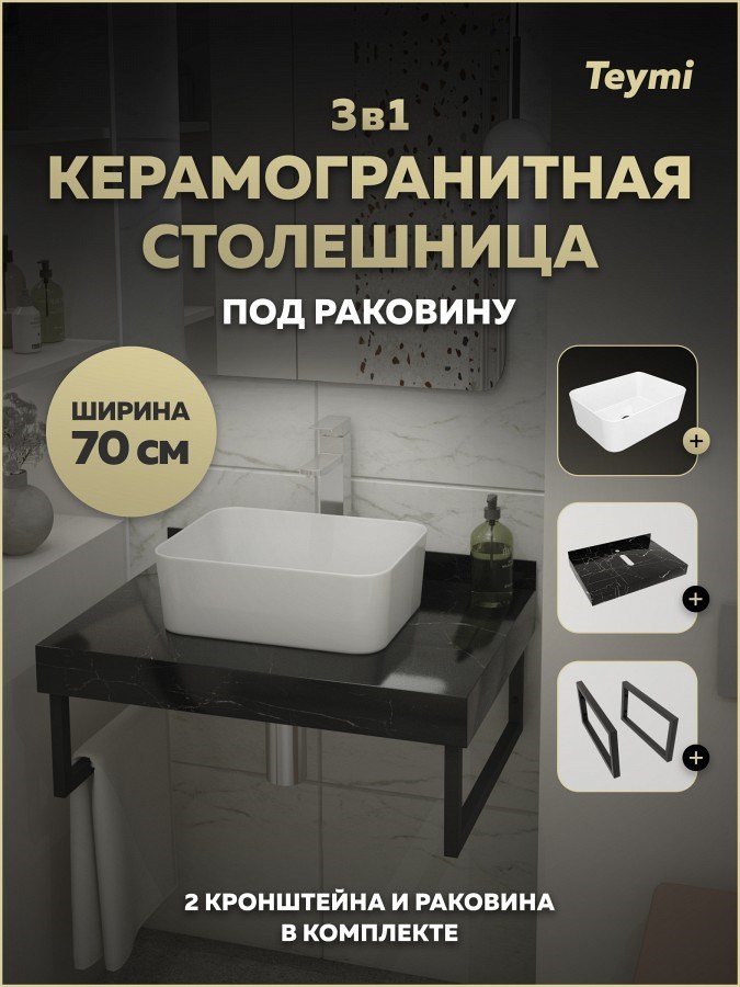 Столешница керамогранитная 70 см черный мрамор с раковиной Teymi Helmi Mini 40 кронштейны 2 шт. черные в комплекте F15422