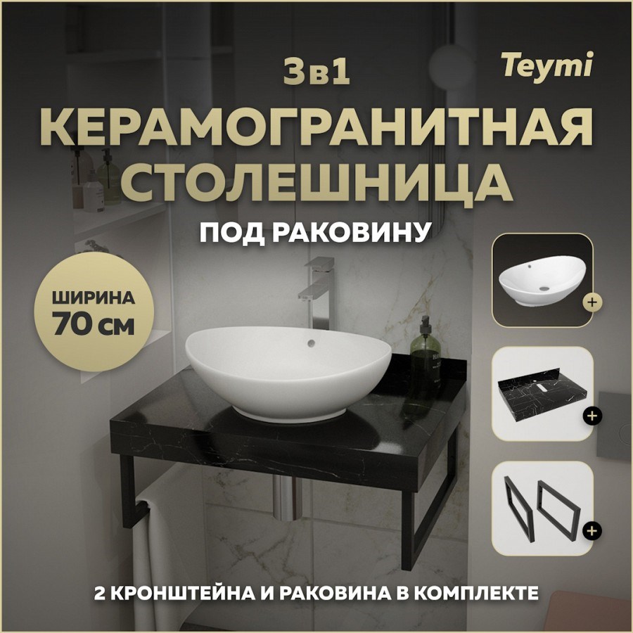 Столешница керамогранитная 70 см черный мрамор с раковиной Teymi Lori 60 кронштейны 2 шт. черные в комплекте F14358