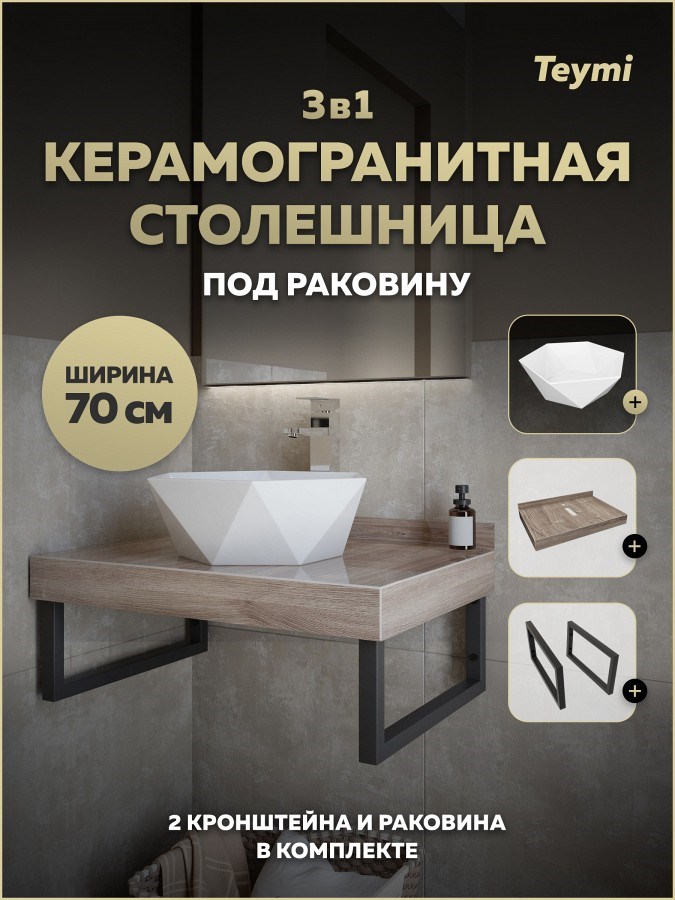 Столешница керамогранитная 70 см дуб кашмир с раковиной Teymi Diamond 48 кронштейны 2 шт. черные в комплекте F15608