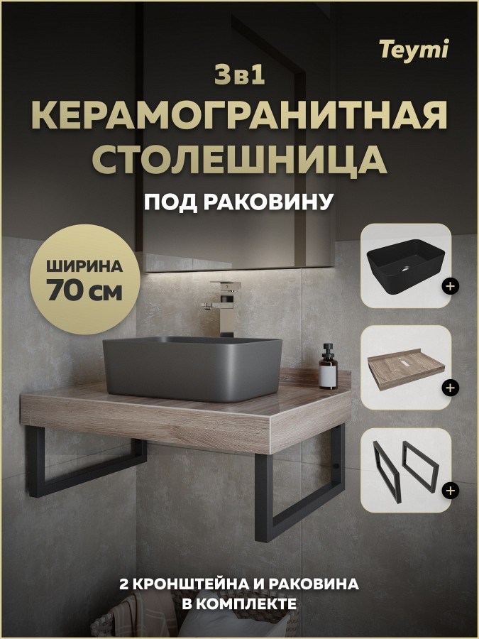 Столешница керамогранитная 70 см дуб кашмир с раковиной Teymi Helmi Mini 40 черная матовая кронштейны 2 шт. черные в комплекте F15614