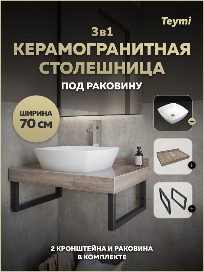Столешница керамогранитная 70 см дуб кашмир с раковиной Teymi Kati 43 кронштейны 2 шт. черные в комплекте F15590