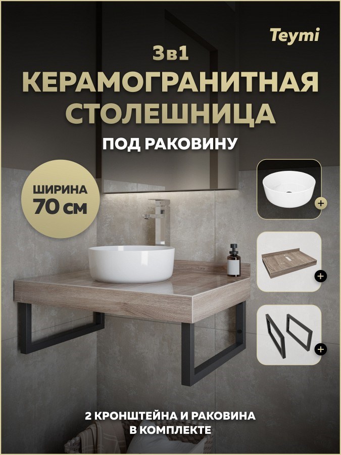 Столешница керамогранитная 70 см дуб кашмир с раковиной Teymi Lina D31 кронштейны 2 шт. черные в комплекте F15606