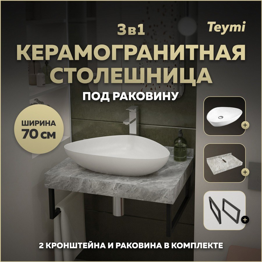 Столешница керамогранитная 70 см серый мрамор с раковиной Teymi Ellie 60 кронштейны 2 шт. черные в комплекте F14227