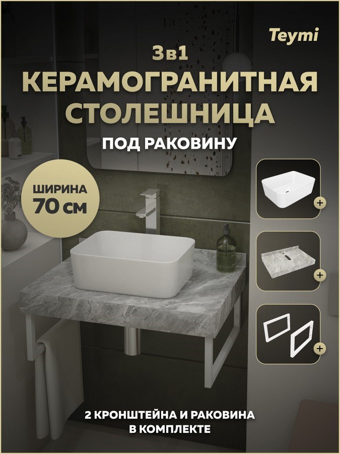 Столешница керамогранитная 70 см серый мрамор с раковиной Teymi Helmi Mini 40 кронштейны 2 шт. белые в комплекте F15412