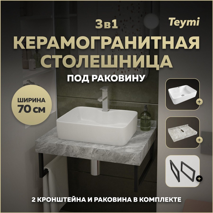 Столешница керамогранитная 70 см серый мрамор с раковиной Teymi Helmi S 48 кронштейны 2 шт. черные в комплекте F14240