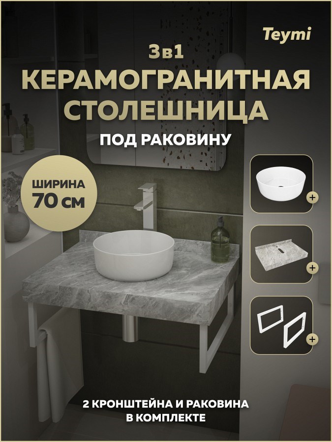 Столешница керамогранитная 70 см серый мрамор с раковиной Teymi Lina D31 кронштейны 2 шт. белые в комплекте F15352
