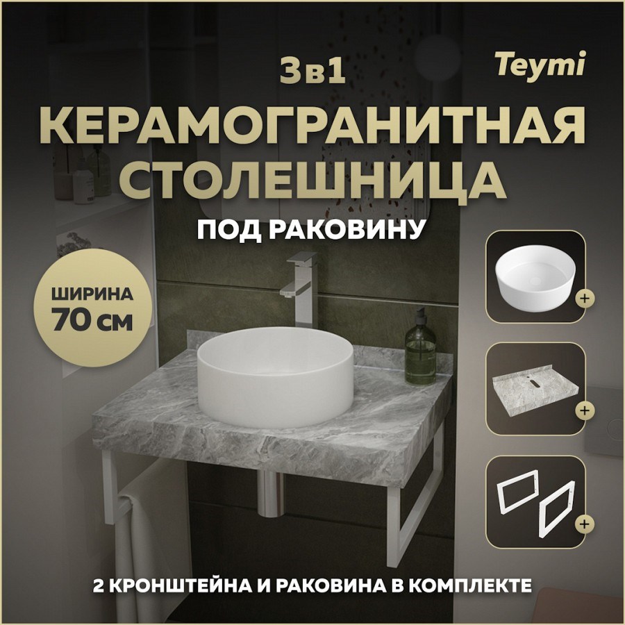 Столешница керамогранитная 70 см серый мрамор с раковиной Teymi Lina D35 кронштейны 2 шт. белые в комплекте F14117
